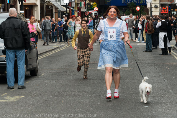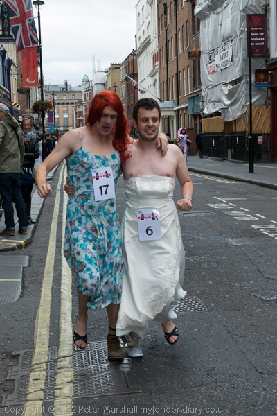 A contestant found it "bloody impossible" to run in these heels. Contestants could also complete as a three-legged pair, one with a little dress slippage