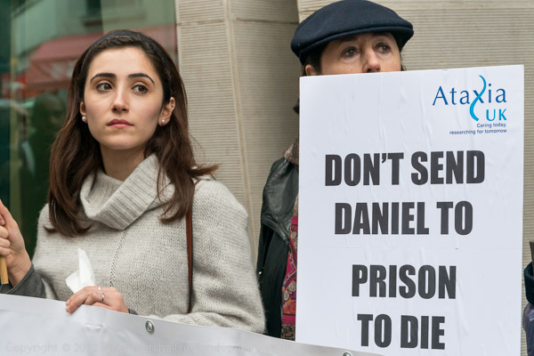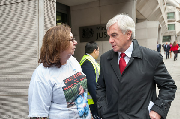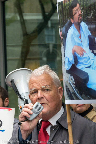 Bruce Kent (left) and John McDonnell MP (right) speaking outside the Justice ministry