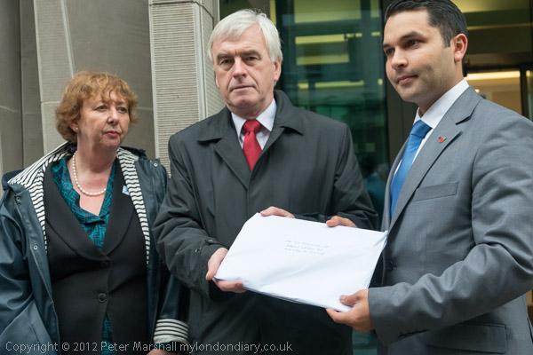 Clare Glasman, Bruce Kent, Anne Hall, Sue Millman and John McDonnell with the letter