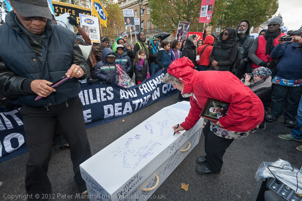 Jan Butler holding a photograph of her son Lloyd, who died in a police cell, and Kadisha Brown-Burrell, the sister of Kingsley Burrell.