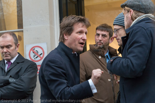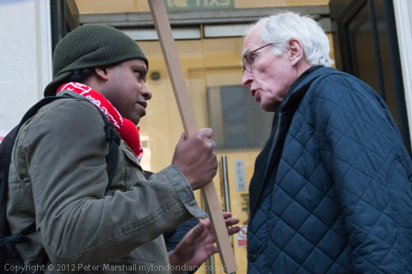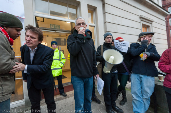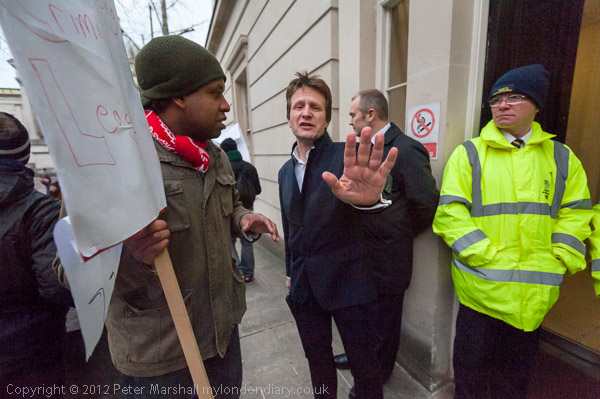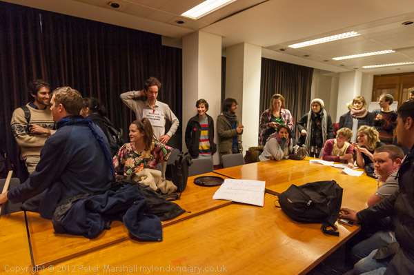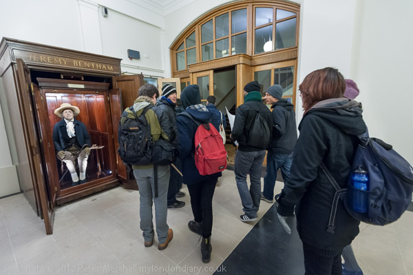 Protesters walk into the building past the dressed skeleton of Jeremy Bentham