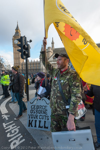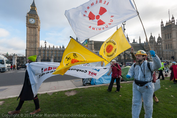 Kick Nuclear with Fukishima flags and a large banner 'Climate Change: Deadlier than the Defecit'