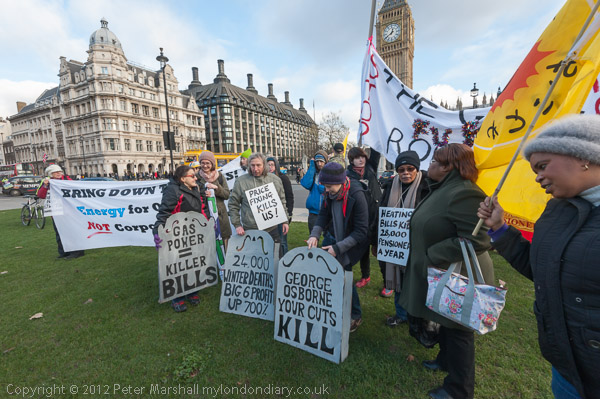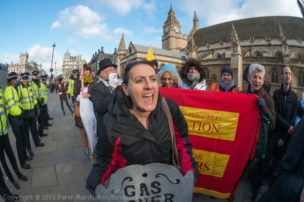 of Parliament. One woman dances in front of the statue of Oliver Cromwell and