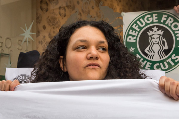 and posed for pictures with the banner 'Refuge From the Cuts'