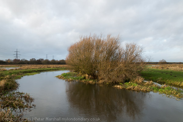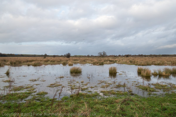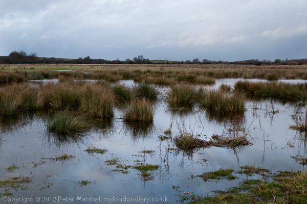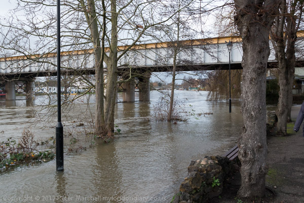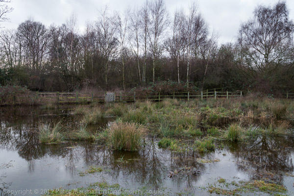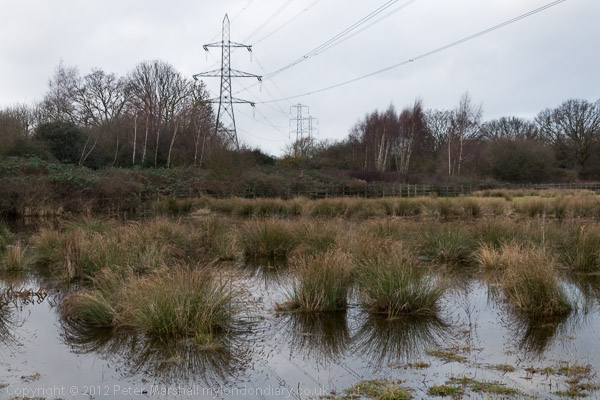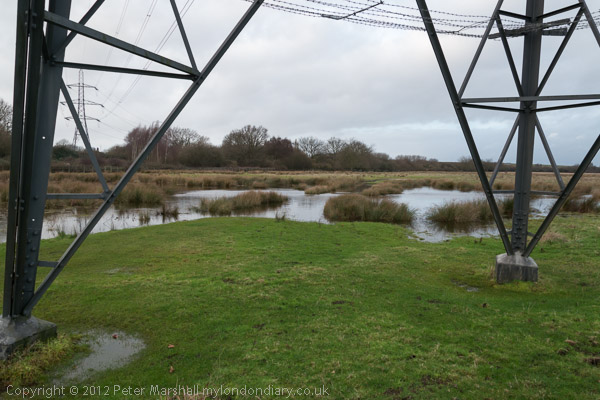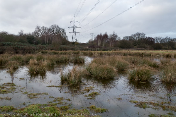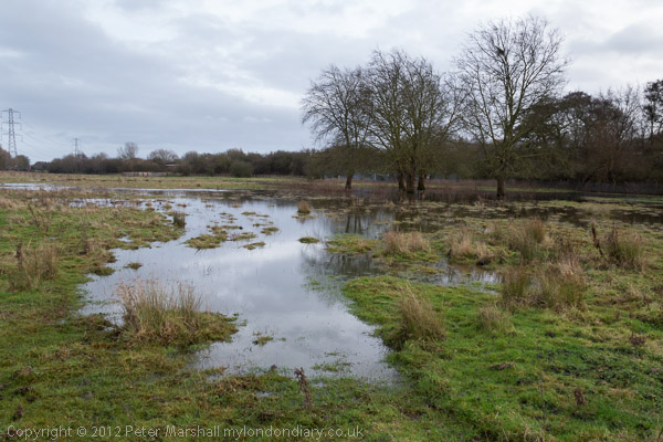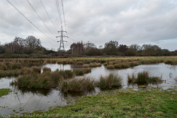 ![]() Staines Railway Bridge, with some flooding on the towpath ![]() The River Colne on Staines Moor - with some flooding at left ![]() More flooding on the moor ![]() ![]() Remains of the old fence along the edge of land where the Great Western line ran ![]() ![]() We had to abandon our plan to walk across here ![]() ![]() ![]() |