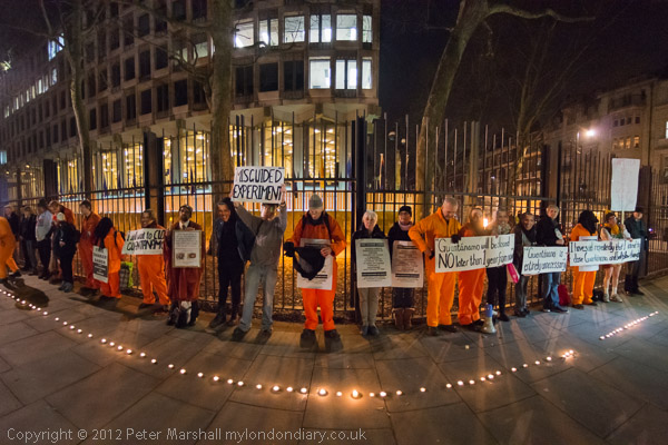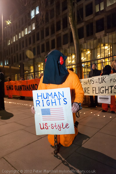 Human Rights US Style - hooded, chained and wearing ear muffs