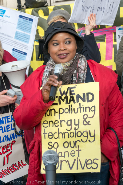 and an anti-nuclear protester calling for Green cheap energy for all, not profits for the few and a boycott of EDF