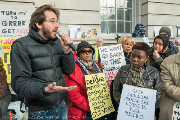 'Can't Pay Won't Pay' on the door of the DECC and people fixed their comments on 'bills' on a washing line