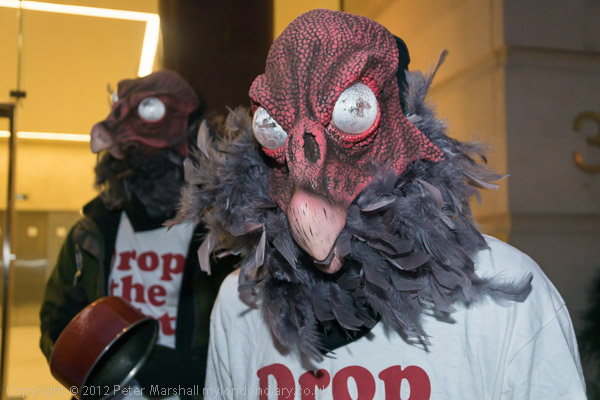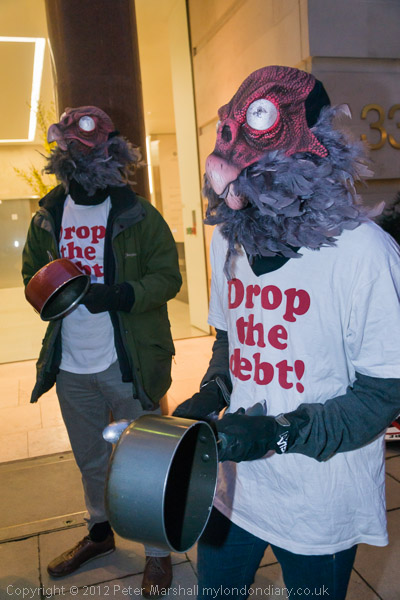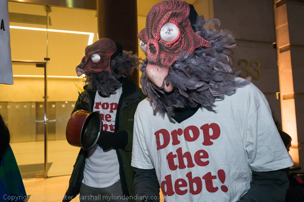 The 'No Vultures' graphic on the banner - and a vulture with a placard