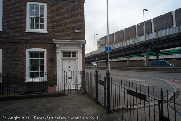 Later at lunch there was some scepticism when I said that the former start of one of Staines's several rivers was still visible from Church St, so we had to come back into Staines to take a look. The former town ditch Sweeps Ditch used to run from the River Colne just after it was joined by the Wyradisbury River, and ran between the lino factory and the back of the High St, then along beside Factory Path and go below the High St and then under the now missing railway curve between the Windsor and Reading lines before going under the Reading line and flowing south - after a bit along the back of our garden and eventually into the Thames. The town ditch was blocked when they built a one-way system around 30 years ago, but south of the railway Sweeps Ditch still flows - at least usually - but is now pumped up from the Thames in the Thames St car park and piped to its old route. Except when the pump stops working, as it did for much of last year. Spelthorne Council seemed to have given up on it, but local councillors gave money from their 'better neighbourhood grants" to get the pump repaired.