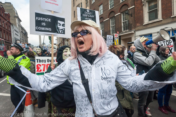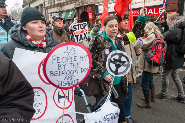going down Whitehall. A disabled campaigner from DPAC with the message that 2/3 hit by the tax are disabled