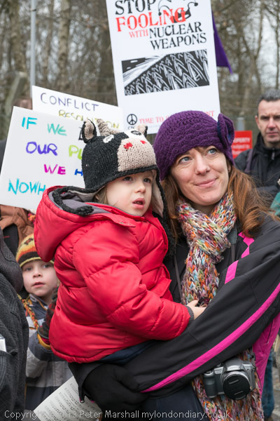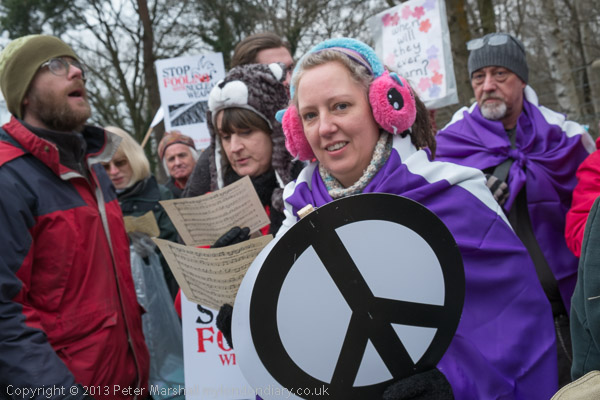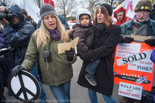 Singing the anti-nuclear song 'One nuclear bomb can ruin your whole day'. A poster asks How Many Schools and Hospitals will be sold to replace Trident