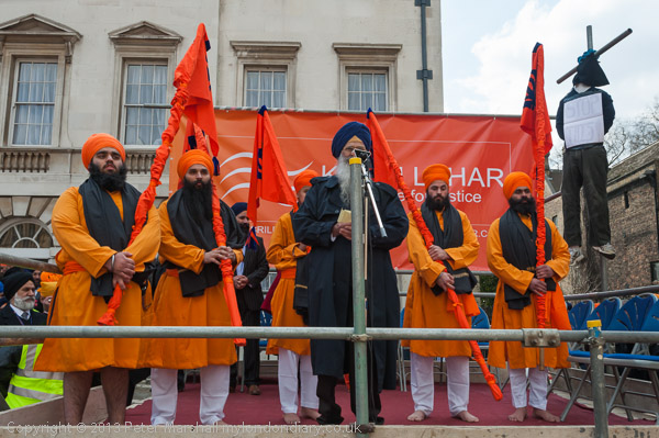 Five men with Sikh flags at the back of the stage, and to their right a hanging figure