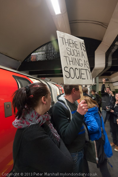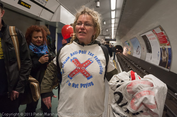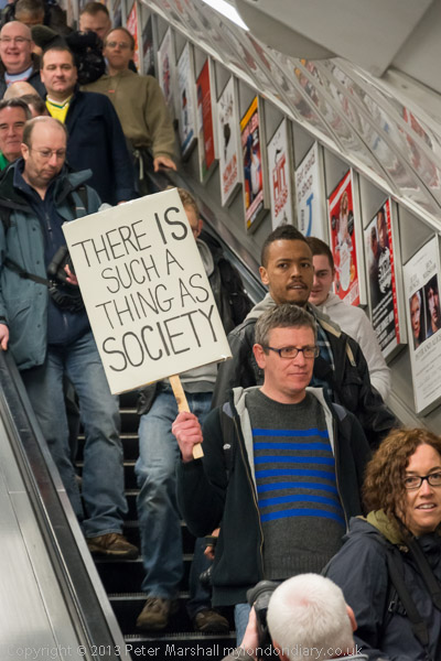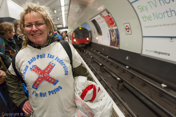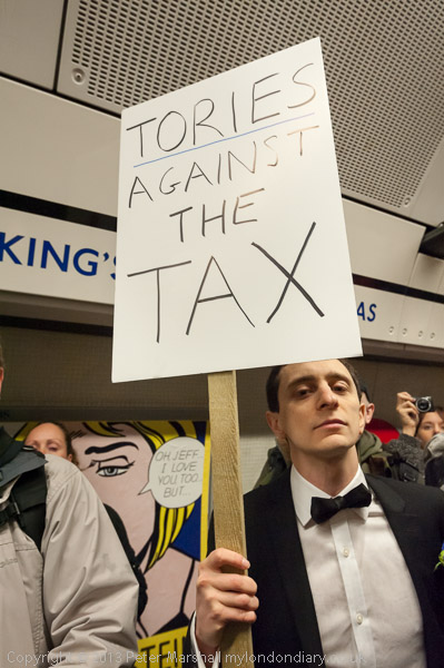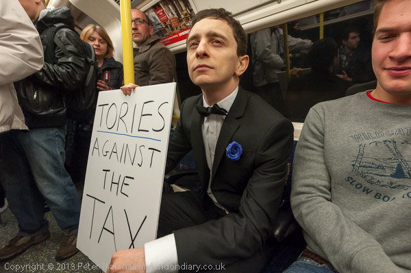 ![]() Eventually the group got on the move ![]() Although the people leading it didn't know where we were going ![]() ![]() There was more confusion on the Underground with groups of us standing around and not knowing which platform to go to, but eventually most made it ![]() A woman was wearing her Anti-Poll Tax Federation shirt ![]() Will the Bedroom tax be the new poll tax - and bring Cameron down? ![]() Though one of the most photographed people on the march was in black tie with the poster 'Tories Against the Tax' ![]() I'd been photographing him on the platform and he came and posed for me on the train ![]() When the train reached Archway we got the message to alight |