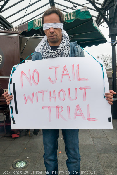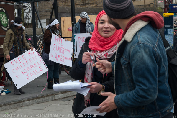 Human rights protesters from Camden with blindfolds and placards calling for the release of Palestinian