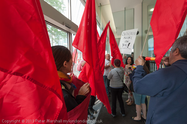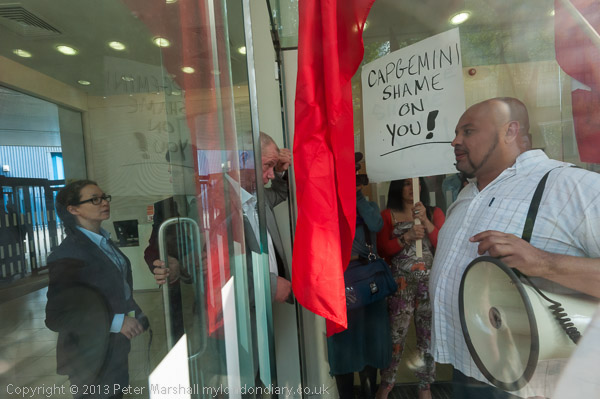 ![]() Alberto points to the Capgemini building ![]() ![]() 'Capgemini Shame on You!' and 'Stop Racism at Capgemini' placards ![]() The cleaners try to go inside again ![]() but are stopped by a man standing in the doorway - they don't try to push past ![]() but keep up their protest in the entranceway ![]() ![]() ![]() ![]() ![]() Capgemini have rather dirty windows but I took a picture through them of Alberto Durango facing the people at the door |