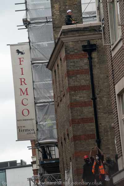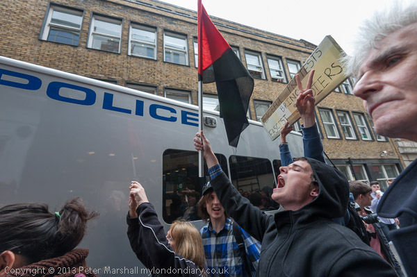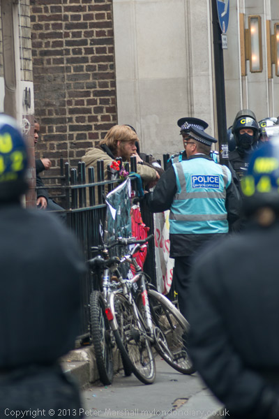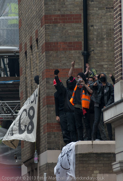 The police with riot shields were opposite the front of the building. Inside were a fairly small number of peaceful protesters, including some children