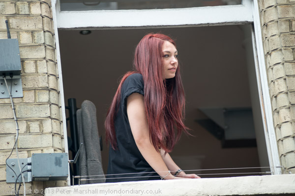 A woman watches the street from an upper floor window,