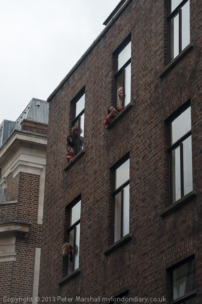 People watched the street from shops and other windows