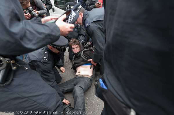 Black-clad protesters and police on a Mayfair corner where another arrest is taking place