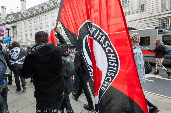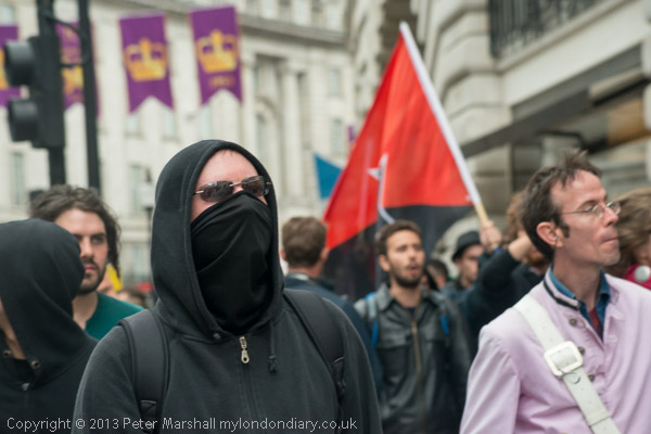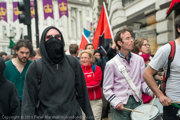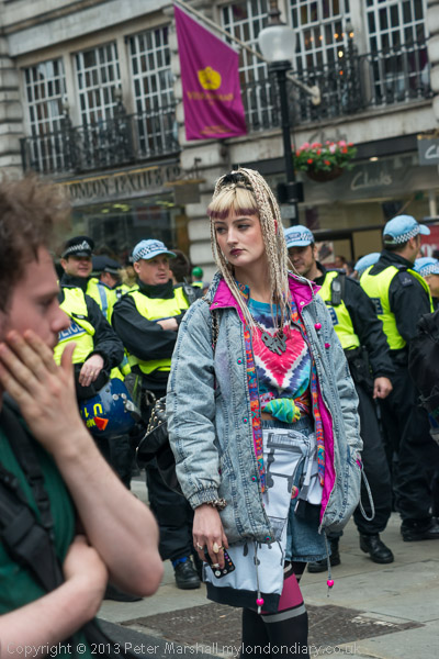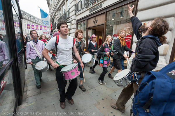 A police officer comes to tell the protesters they need a licence to play music on the street in Westminster