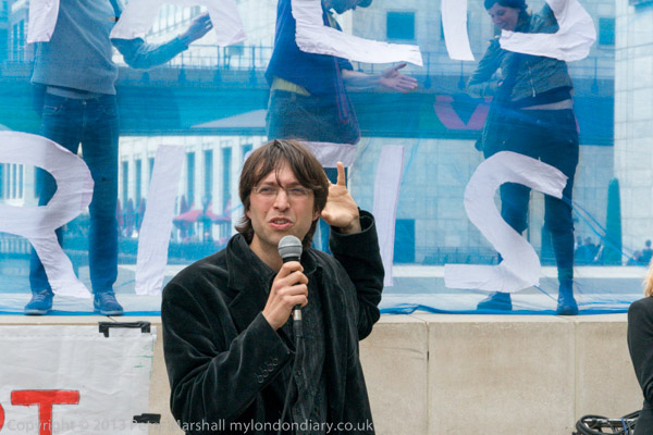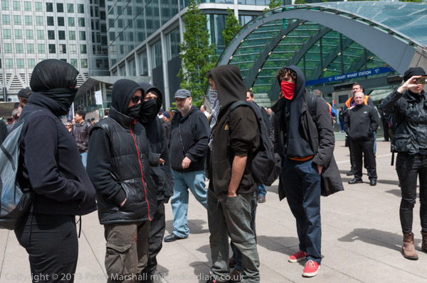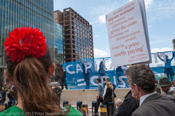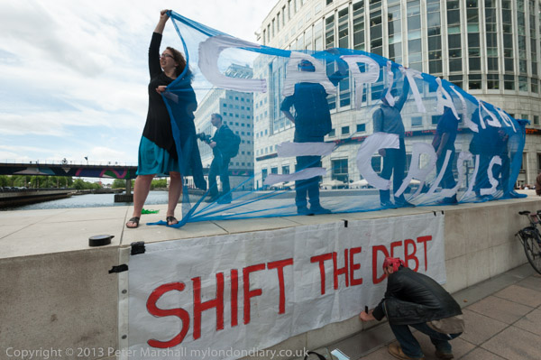 'G8's New Alliance feeding Africa to the Corporations' and the corporate US flag in front of Canary Wharf