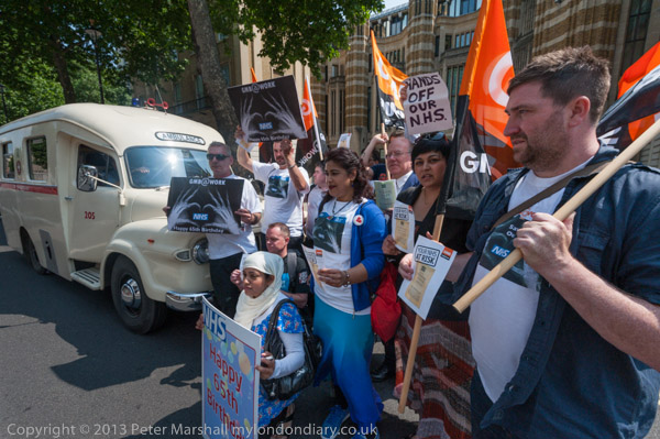 The GMB trade union brought 3 vintage ambulances to Westminster for a protest outside Parliament saying the NHS is at Risk, and in Whitehall, where they took in 65th Birthday cards for the NHS, with the message inside "Do Not Pension Off Our NHS'. A few other 'Save the NHS' protesters joined in with the protest.