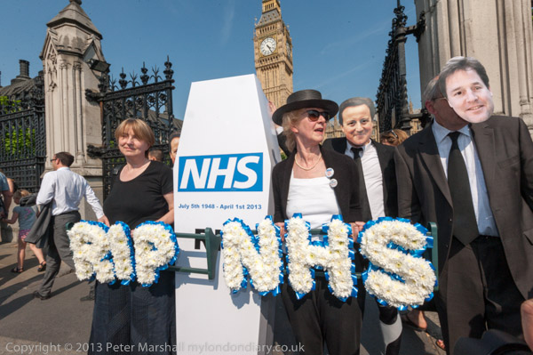 Before Peedell, co-leader of the National Health Action Party and another doctor running with him set off, the National Health Action Party held a protest outside the Dept of Health in Whitehall with a coffin and wreaths for the NHS, then briefly outside Downing St and the Houses of Parliament before holding a rally in Old Palace Yard. Speakers there included former MP and co-leader of the NHAP Dr Richard Taylor, Dr Clare Gerada, the Chair of the Royal College of GPs and Save Lewisham Hospital Campaign Chair Louise Irvine.