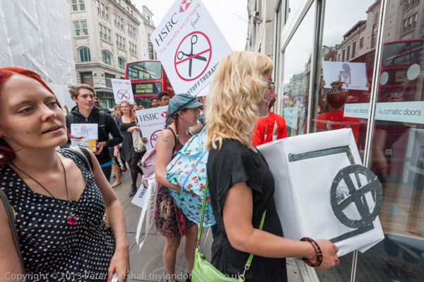 The central London action by around a hundred activists was one of those in 13 cities around the country targeting HSBC branches from Glasgow to Exeter. In Brixton, they managed to set up their protest food bank inside the branch, but those in central London were closed down by the HSBC and the doors locked before the protesters arrived.