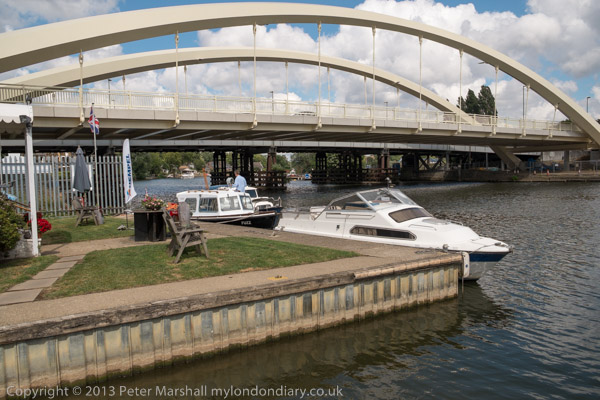 Shepperton first got a bridge across the River Thames to Walton in 1750, a fancy wooden structure similar to Cambridge's Mathematical Bridge but rather larger, and four years later Canaletto came to paint it. Perhaps it didn't scale up well, as a little over 30 years later it was declared to be dangerous and taken down.