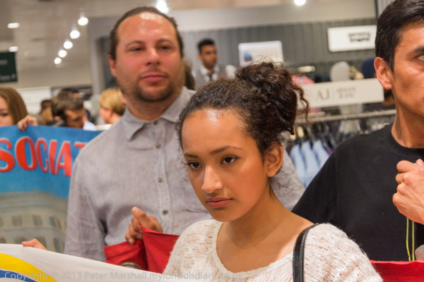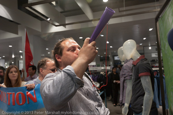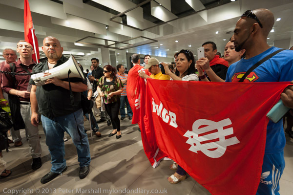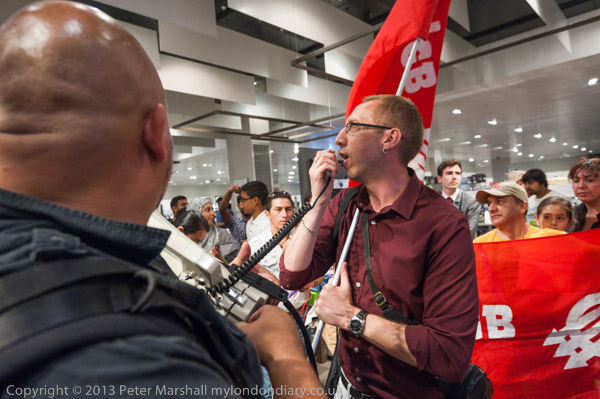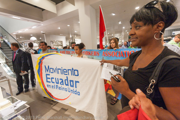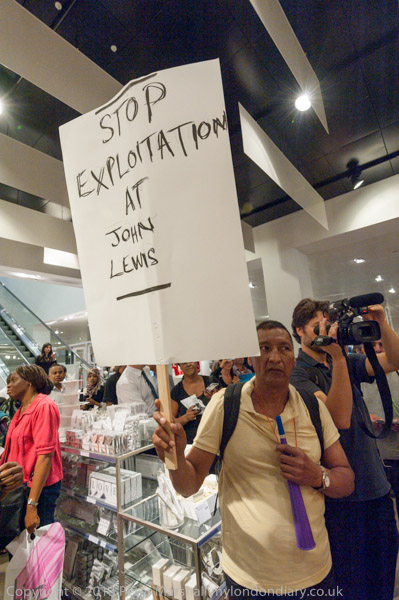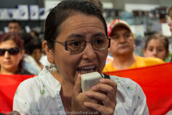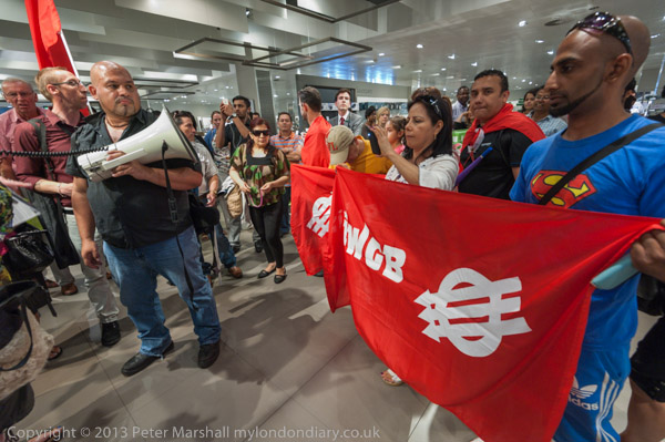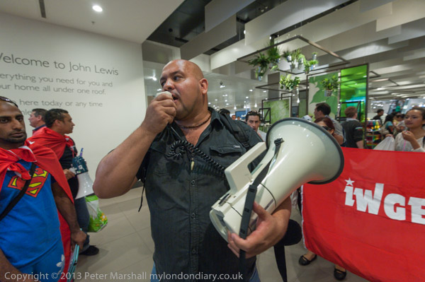 Alberto Durango of the IWGB speaks in the entrance to John Lewis - telling them "we''ll be back' until cleaners get justice