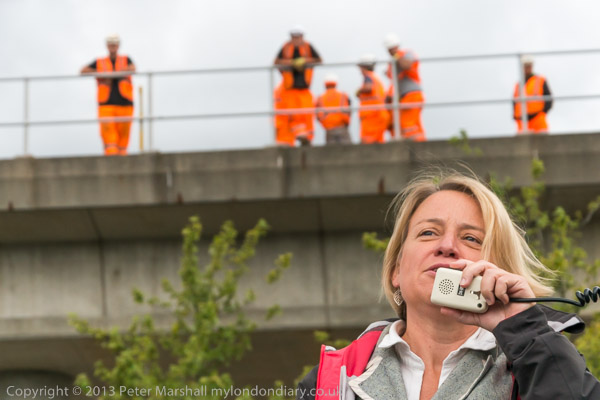 Green Party leader Natalie Bennett speaks - and workers on the DLR watch