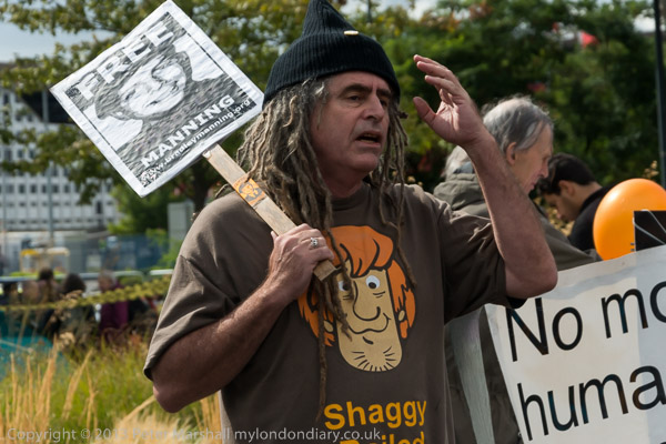 Its cold and wet but one protester doesn't seem to feel it