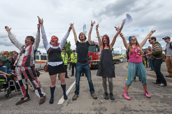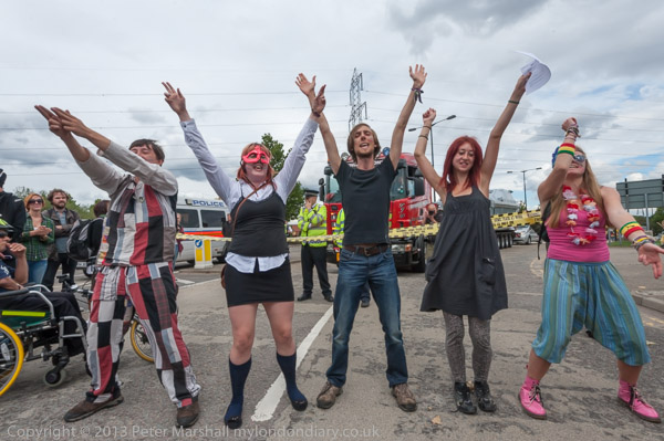 The dancers dance in front to the lorries that can't get in