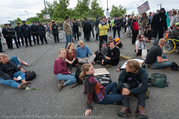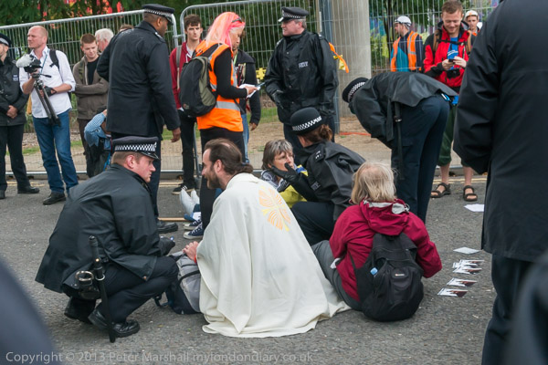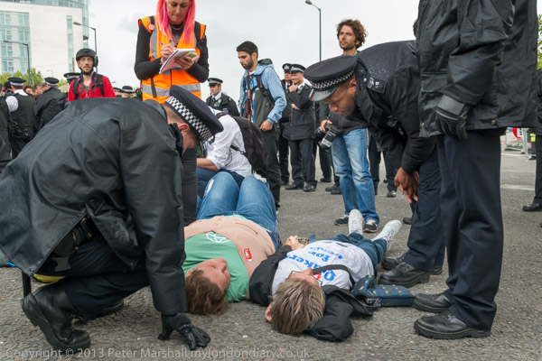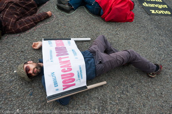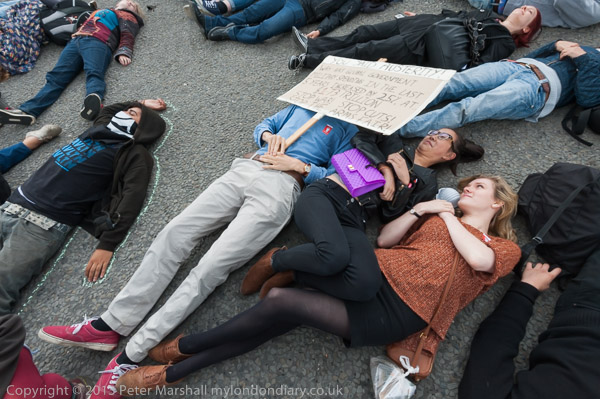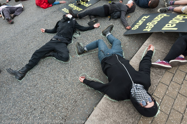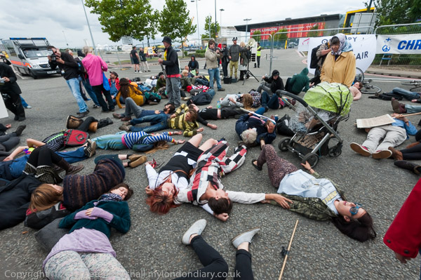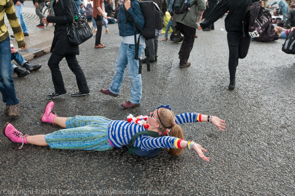 Soon there are quite a few people feigning dead on the road outside the gate to the ExCel centre