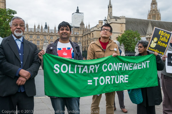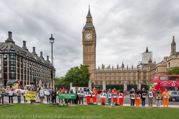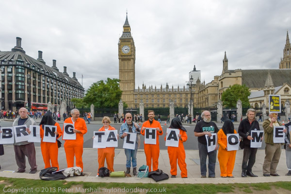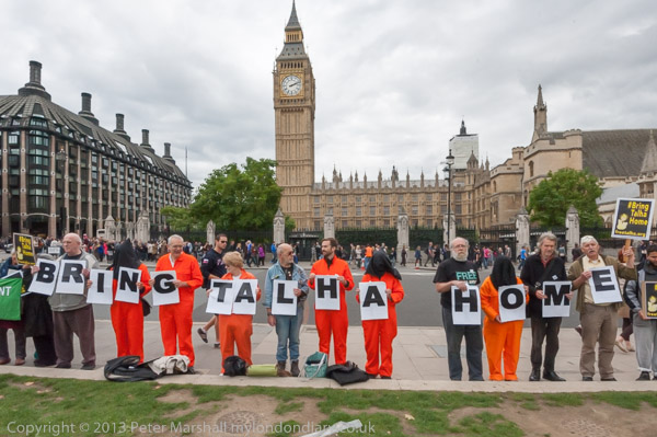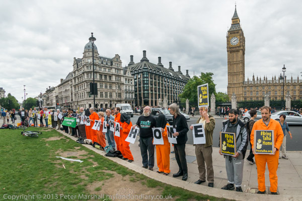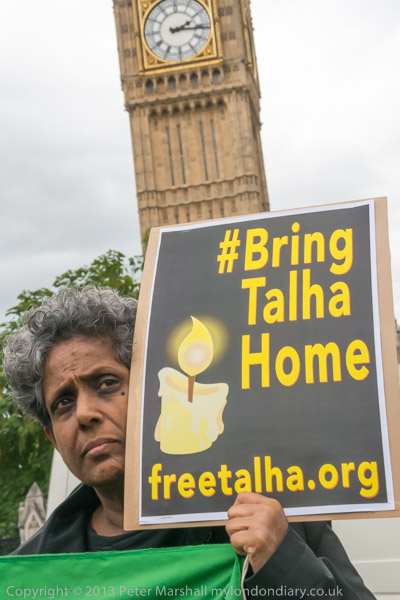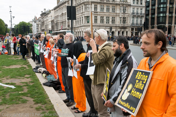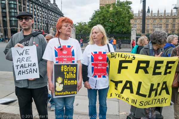 Bring Talha Home - a row of protesters hold a vigil in front of Parliament on the first anniversary of his extradition