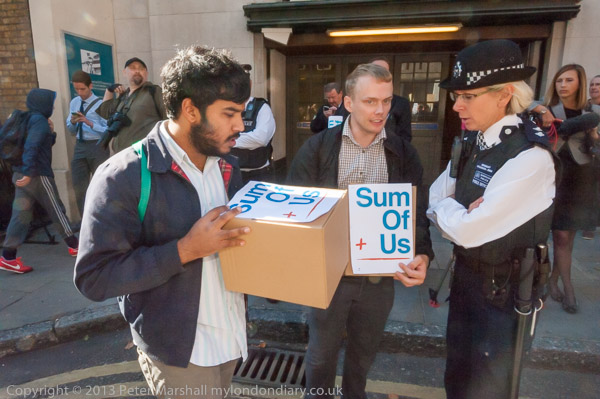 A police officer looks at the petition, which the organisers had got permission to hand in