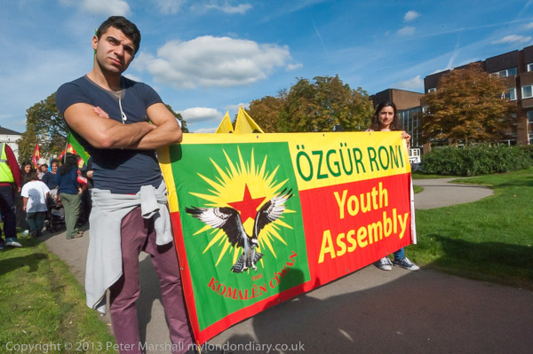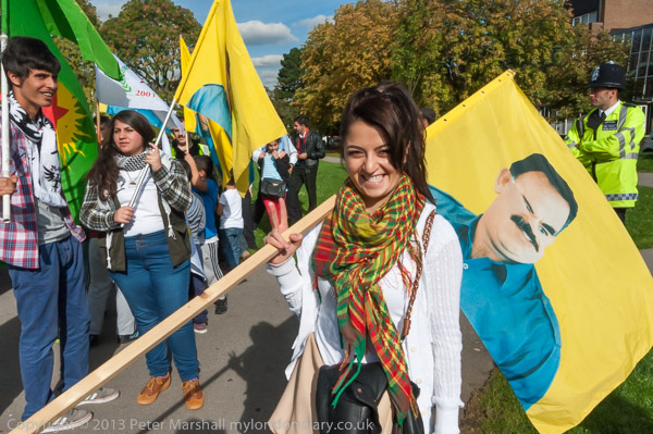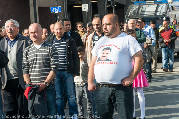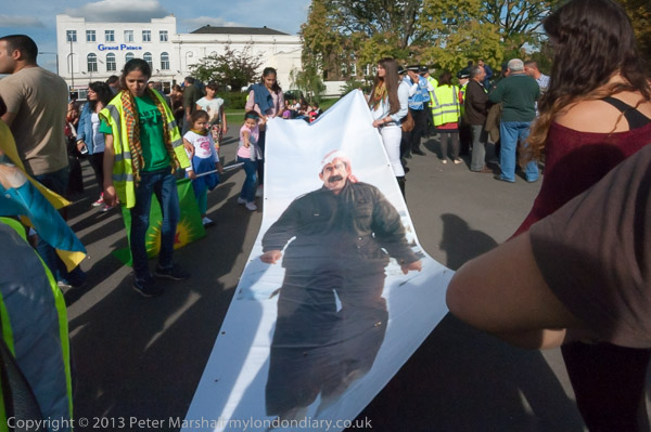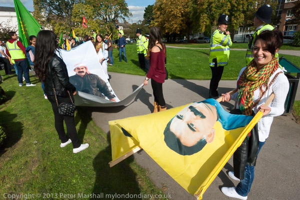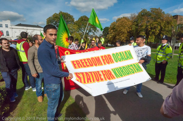 'Freedom for Ocalan - Statute for Kurdistan' in red, green and yellow - the colours of the Kurdistan flag