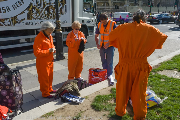 Protesters dress up in orange jump suits and black hoods opposite parliament