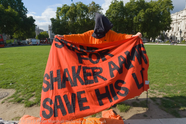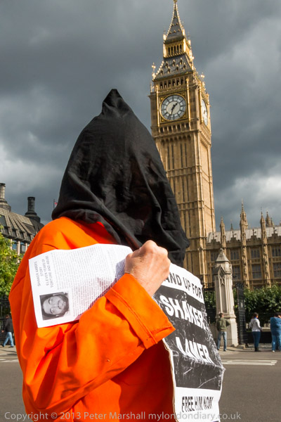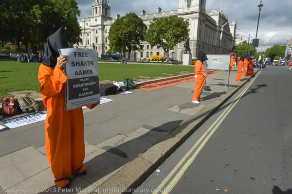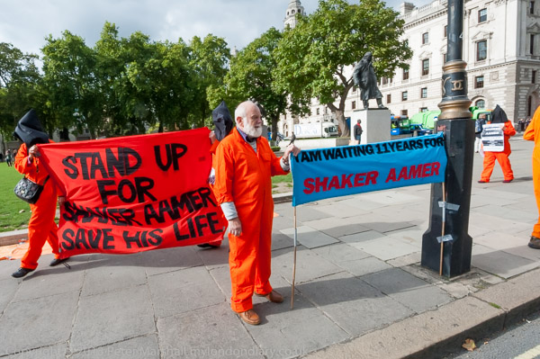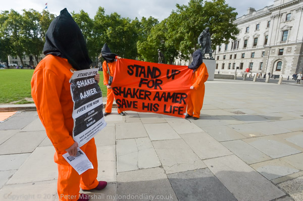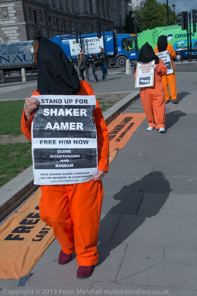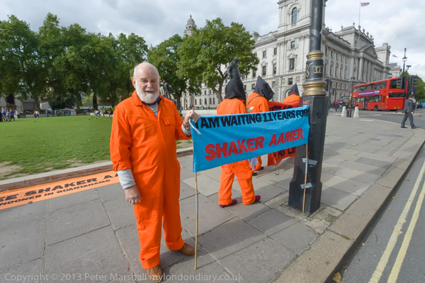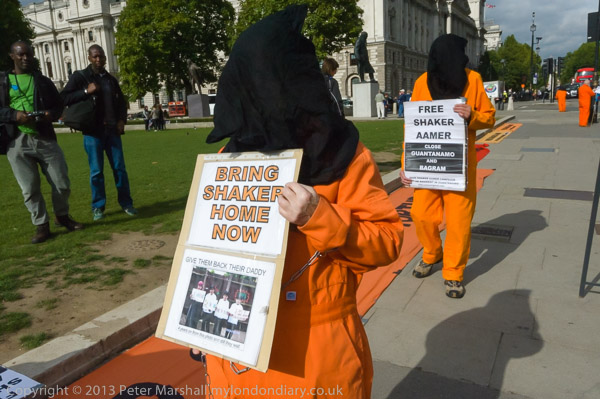 and placards calling for the US to release Shaker Aamer, a Londoner still held in Guantanamo despite having been cleared for release under both