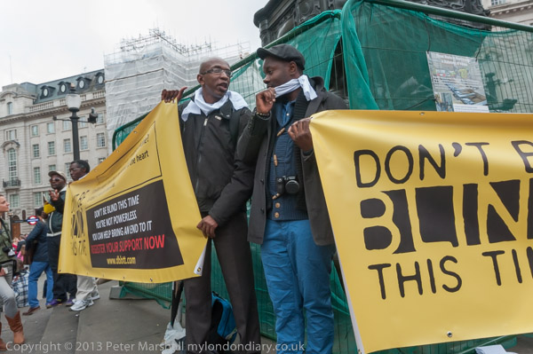 The banner give the figures - 8m murdered, 500,000 rape victims....