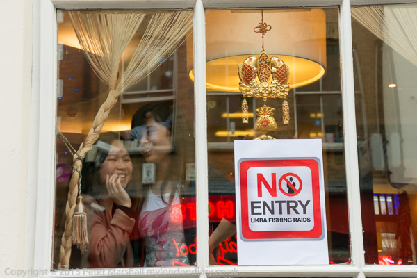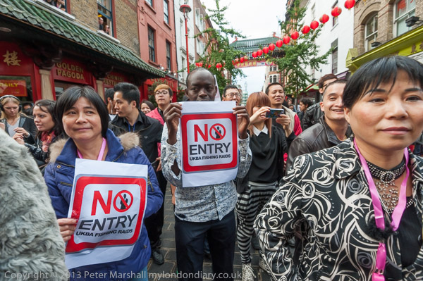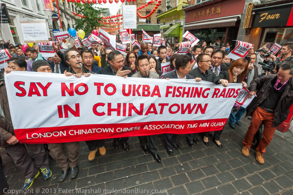 The banner reads 'Say No to UKBA Fishing Raids in Chinatown'
