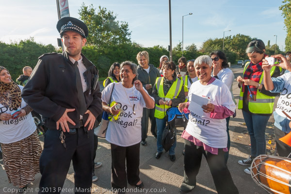 A police officer comes to talk to Southall Black Sisters as they begin their protest