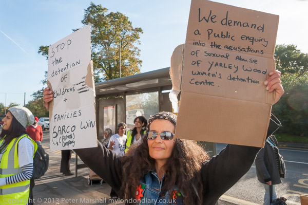 Protesters at the gate to Eaton House, the Home Office Immigration Reporting Centre at Hounslow Heath