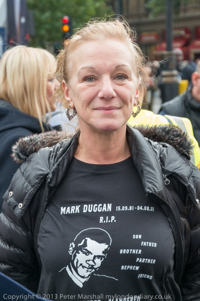 The banner behind the figures is for Mark Duggan, killed by police in 2011; police actions triggered widespread rioting