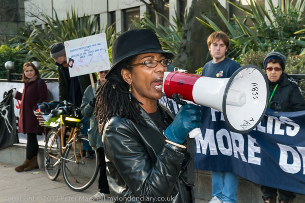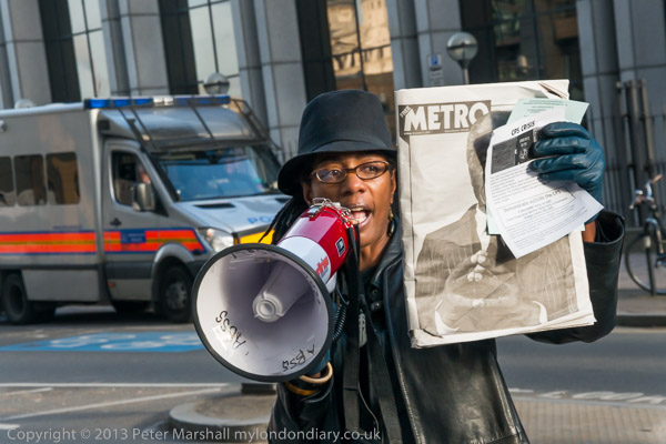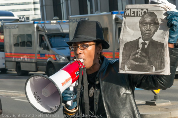 Marcia Rigg began her speech with a tribute to Nelson Mandela, holding up his picture on the front of the Metro