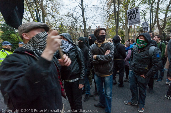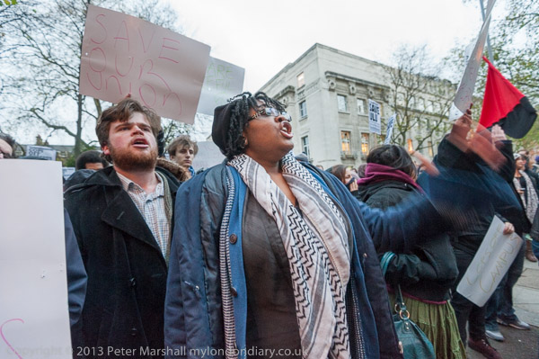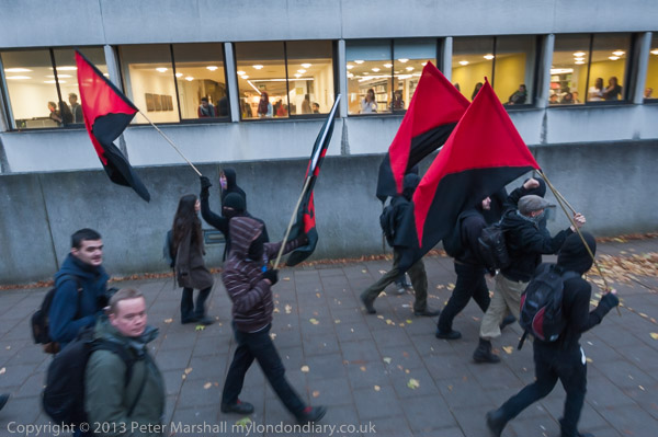 Students stop and shout for a few minutes outside the Malet St gates of Senate House