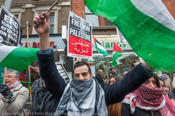 A few protested in Anonymous masks. Many wore Palestinian scarves, and there were many women in Muslim headscarves