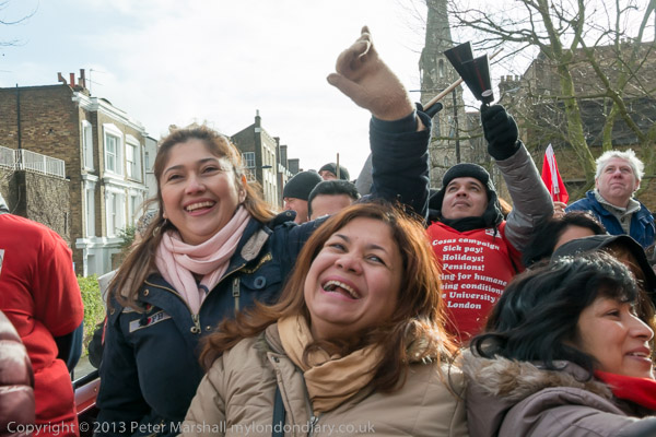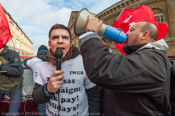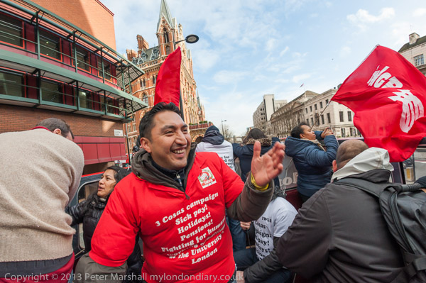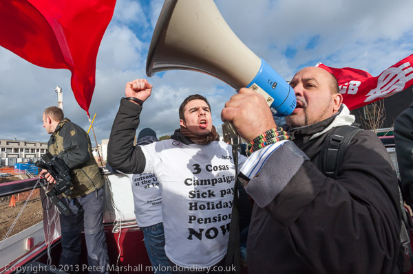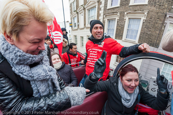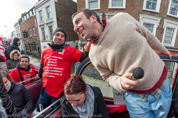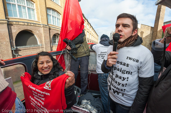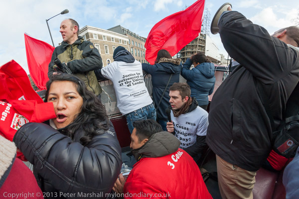 '3 Cosas' Strike IWGB Battle BusSenate House to Parliament Square, London. Tue 28 Jan 2014 |