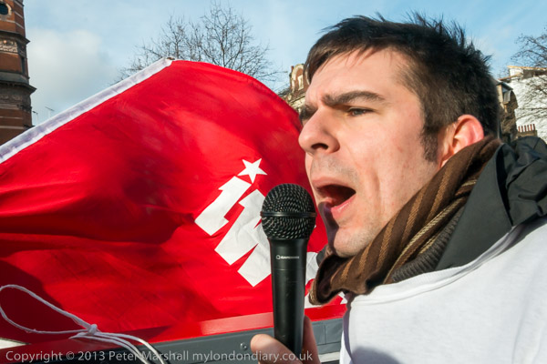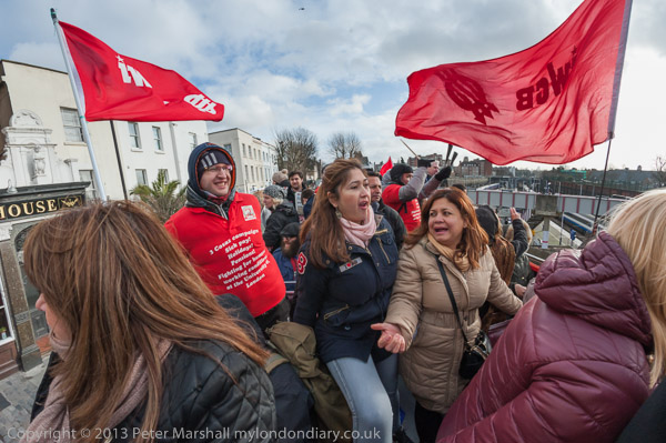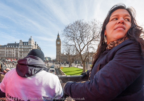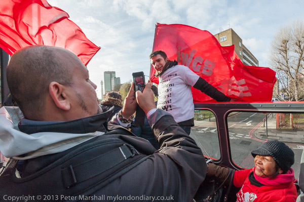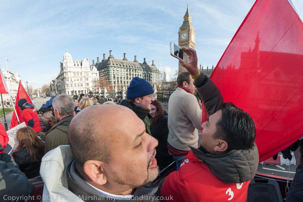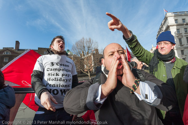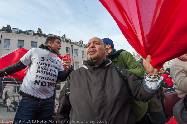 '3 Cosas' Strike IWGB Battle BusSenate House to Parliament Square, London. Tue 28 Jan 2014 |